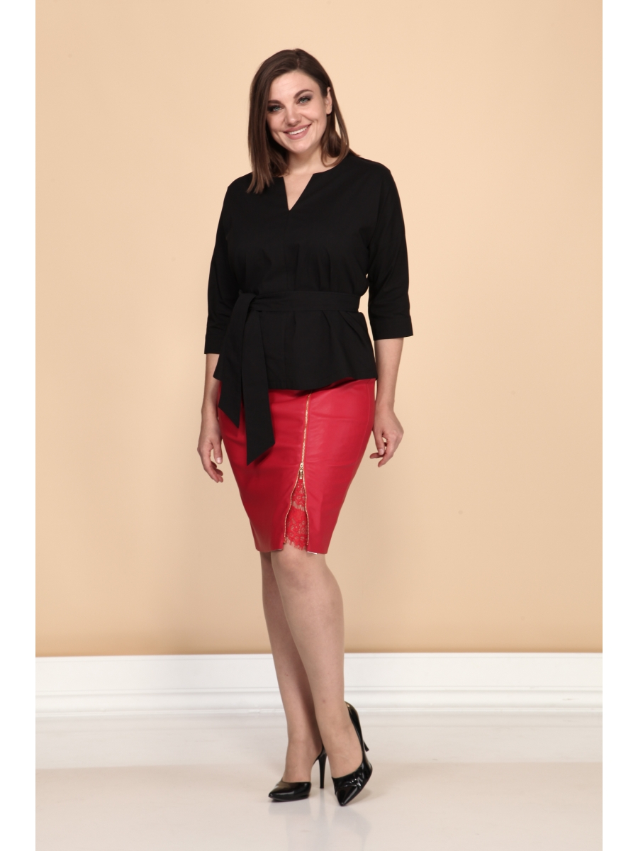 Юбка из экокожи, по передней части юбки слева металлическая молния - 55 см, при расстегивании видно кружево, до 30 см в высоту можно открыть ногу. На подкладке, по спинке потайная молния красного цвета и шлица.