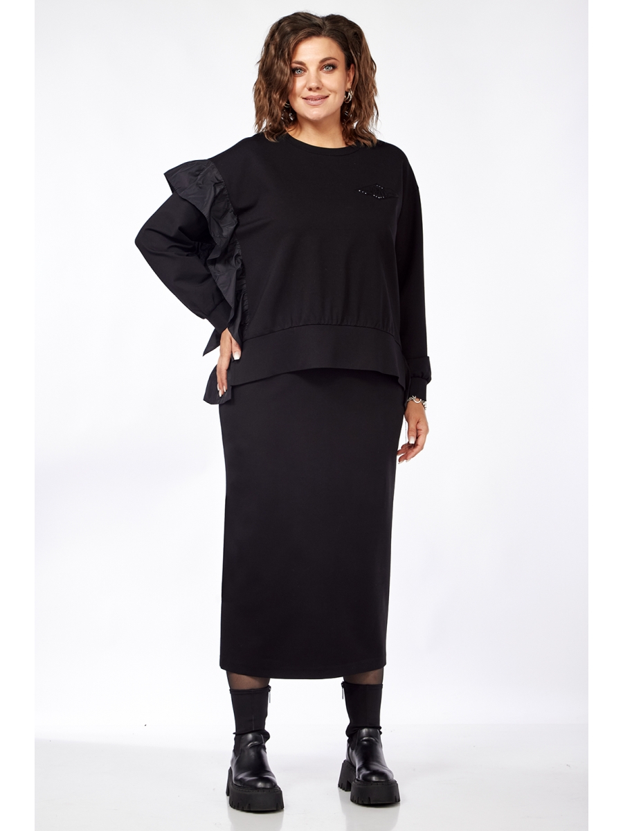 Джемпер свободного кроя, Горловина круглой формы. Рукав спущенный. Декоративными элементами являются рюша из отделочной ткани и печать, декорирована стразами. Низ рукавов на манжетах. Спинка длиннее переда, по низу спинки притачная рюша из отделочной ткани.