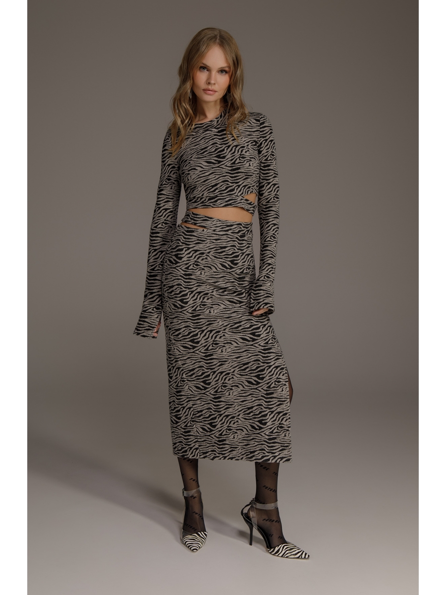 Асимметричный костюм-двойка из трикотажного полотна с анималистичным дизайном.