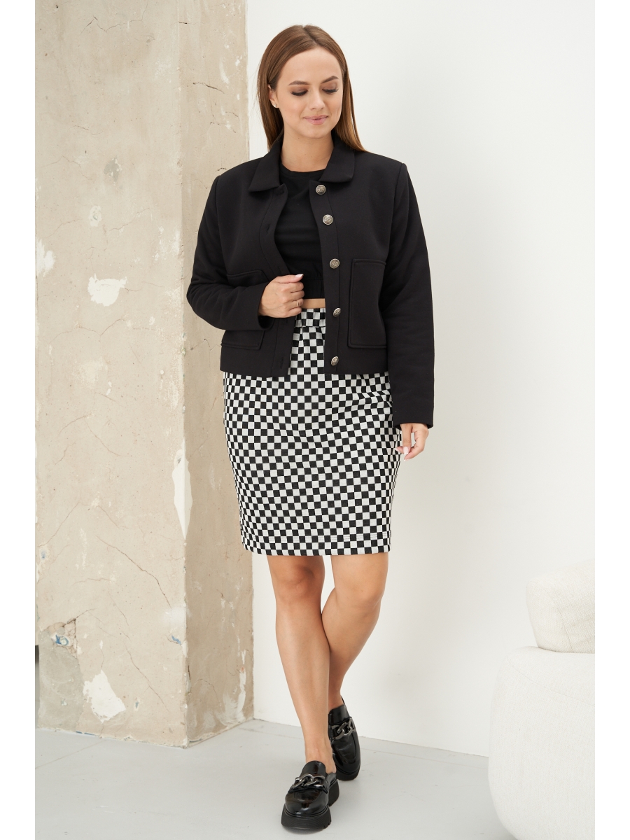 Сочетание чёрного жакета и юбки-карандаш контрастного дизайна - замечательная идея для простого, но модного образа.