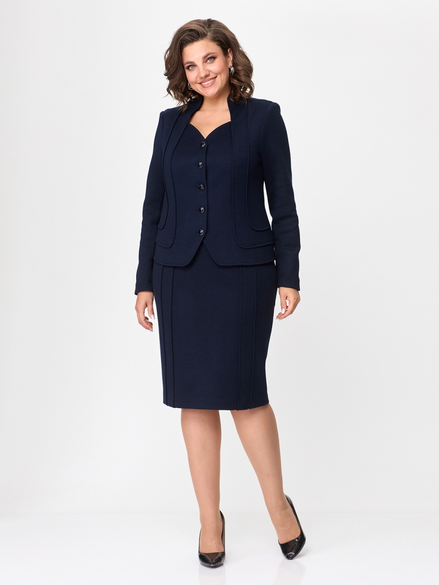 Женский повседневный костюм, состоящий из жакета и юбки. Выполнен из трикотажного полотна с шерстью (30% натуральная шерсть, 70% пан) собственного производства. Жакет полуприлегающего силуэта. Декоративные рельефы по переду жакета и юбки. Рукав втачной. По спинке средний шов, рельефы. Застежка на пуговицах. Спереди на подкладке. Юбка прямого силуэта на подкладке. В поясе, по бокам от вытачки до вытачки с эластичной лентой. На заднем полотнище юбки средний шов со шлицей и застежкой на пуговицу и молнию. Пуговицы могут отличаться от представленных на фото. Костюм хорошо подойдет для работающих в сфере образования и офисных работников. При подборе необходимого размера, используйте таблицу обмерных данных в готовом виде. Чтобы перейти в общий каталог моделей, нажмите на иконку бренда в карточке товара. Все изделия производятся в Республике Беларусь на собственной фабрике. Мы будем рады вашим отзывам и рекомендациям, благодаря им мы становимся лучше! Спасибо, что выбираете ZLATA!