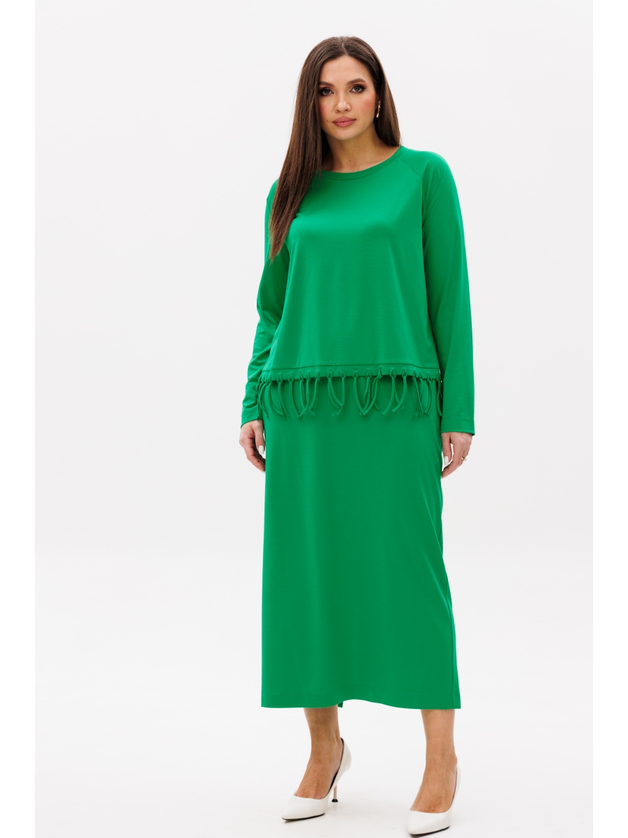 Свободная блуза А-силуэта, покроя реглан с круглым вырезом горловины. Низ изделия с отделочной полоской и бахромой.