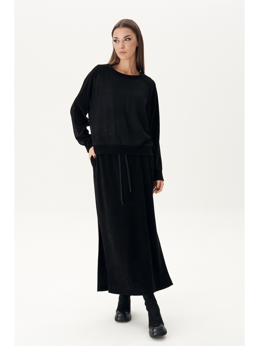Юбка макси, прямая на притачном эластичном поясе с люверсами и отделочным шнуром в кулисе, наклонными боковыми карманами и разрезом сбоку, из текстильного трикотажного полотна эффекта "вельвет".