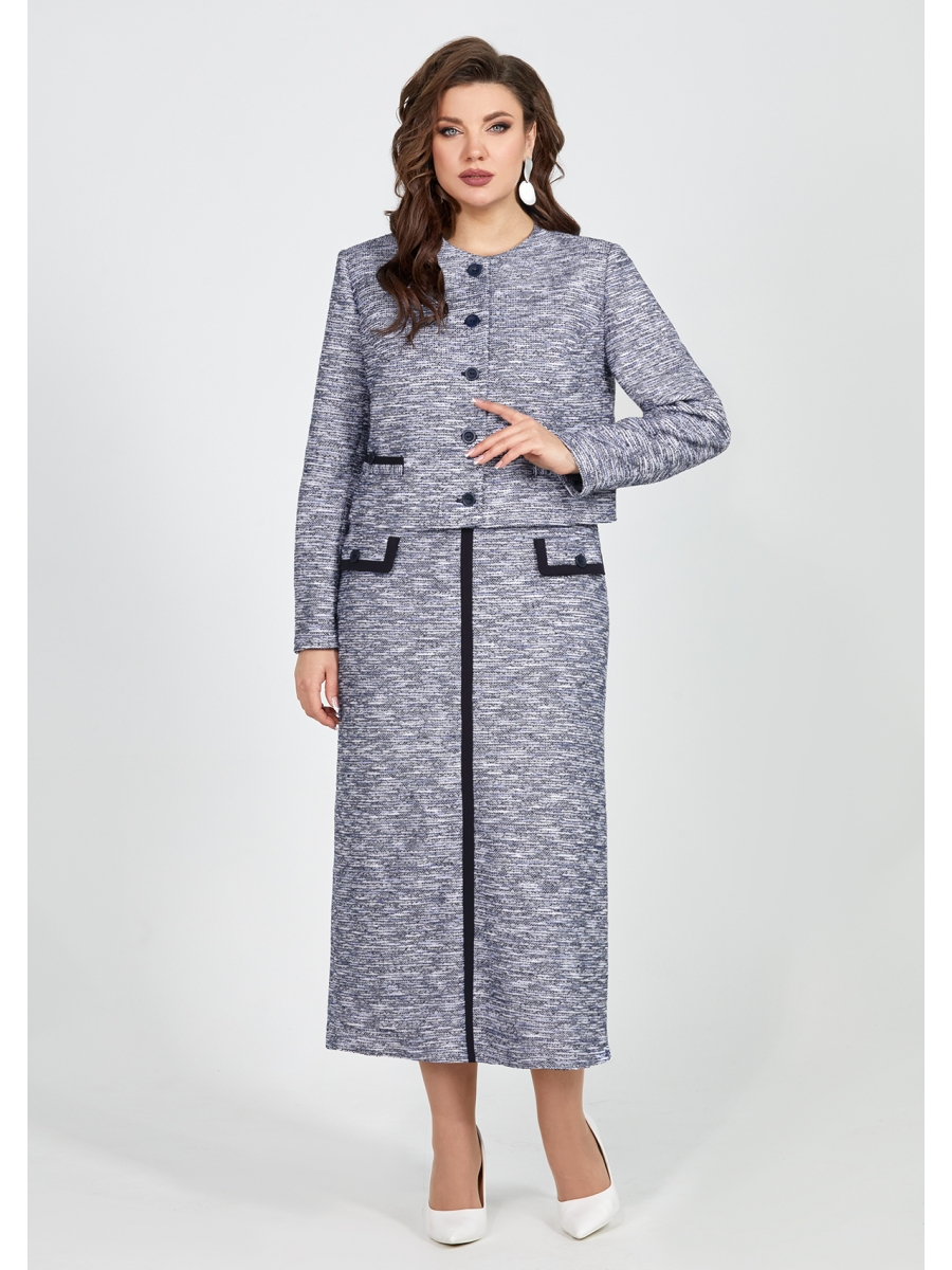 Элегантный, женский костюм, выполнен из меланжевого трикотажа, с отделкой из однотонного трикотажа, состоит из жакета и юбки.