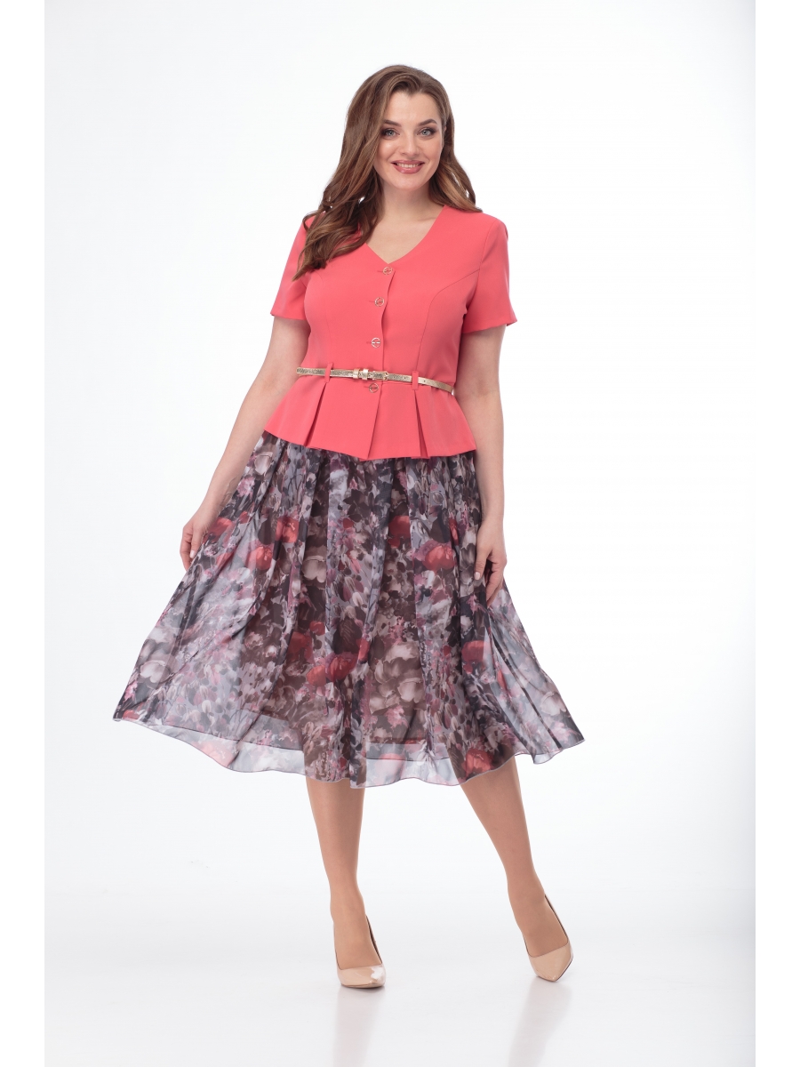 Комплект, состоящий из жакета и юбки. Выполнен из ткани с компаньоном в единой цветовой палитре.