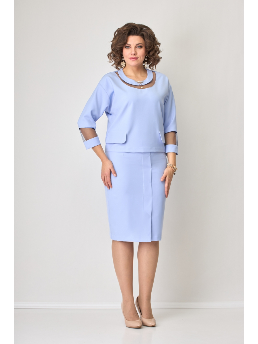 Оформить заказ →Костюм женский двухпредметный, состоящий из блузы и юбки. Блуза силуэта летучая мышь со спущенным рукавом. Горловина переда состоит из сетки и декоративной планки. Рукав заканчивается манжетой. По переду декоративные клапаны из отделочной ткани. Спинка со средним швом на обтачке. Юбка силуэта-карандаш. По переду и спинке обработаны кокетки от которых идут талиевые выточки. На заднем полотнище по центру потайная молния. На переднем цельнокроеная складка имитирующая планку заканчивающейся шлицей. Юбка на подкладке. Длина блузы в 50р-54 см, длина юбки в 50р-64 см