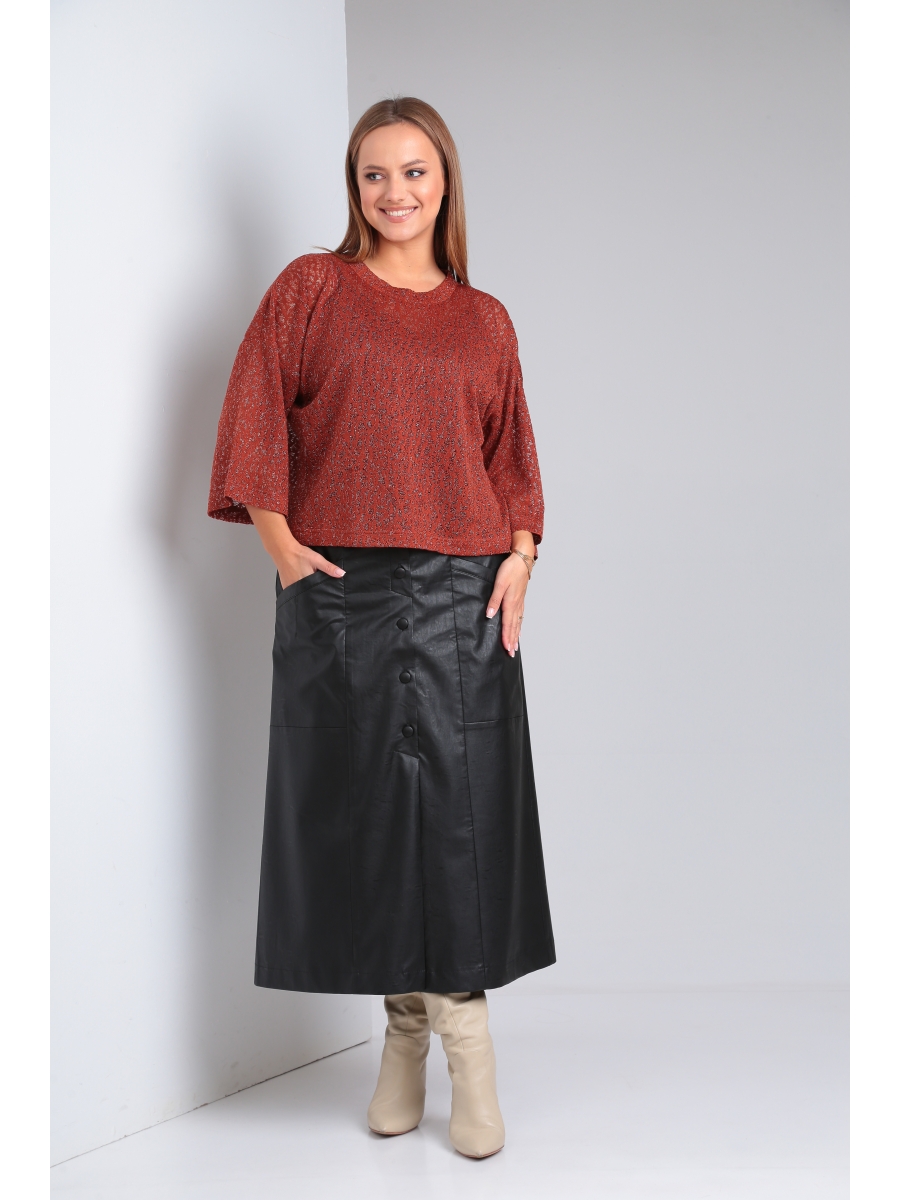 Юбка миди А-силуэта выполнена из экокожи на хлопке. Юбка на подкладке, с поясом, частично на резинке. По переду имитация застежки на петли и пуговицы. Функциональная застежка только верхние 3-и пуговицы. В боковой части функциональные карманы. По спинке вертикальные рельефы.