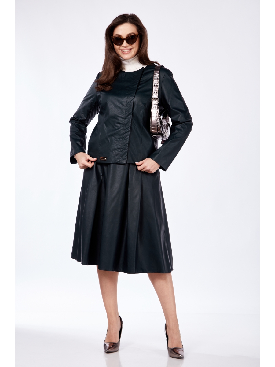 Жакет приталенного силуэта выполнен из экокожи. По переду обработаны рельефы с карманами. Отделкой служит застежка на декоративную железную молнию по диагонали изделия с заходом на кнопки. Спинка разрезная по центру. Рукав двухшовный. Изделие на подкладке.