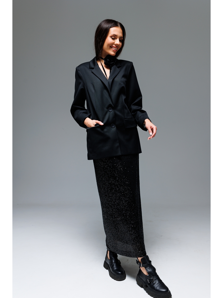 Стильный комплект, состоящий из жакета оверсайз и гламурной длинной юбки из пайеток.