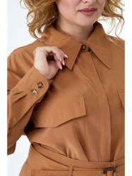 Юбка А -образного силуэта, длины миди, на широком притачном поясе, со шлевками. По переду выполнены боковые карманы с клапанами и функциональная планка на петли и пуговицы. К костюму прилагается пояс с пряжкой из основной ткани.