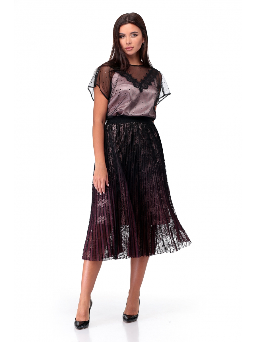 Юбка плиссе из кружевного полотна на контрасной подкладке в цвет топа.