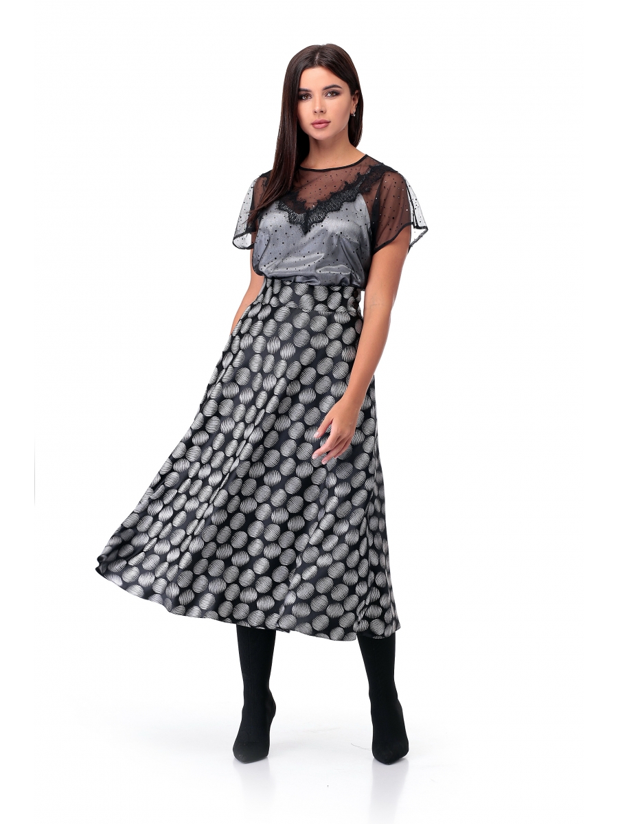 Топ из нарядной сетки в горошек со спущенным рукавом, на довязе украшен кружевом. Застежка на спинке на петлю, пуговицу.