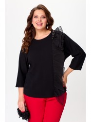 Джемпер выполнен из трикотажной ткани, рукав спущенный, вырез горловины округлый. По переду декоративный волан из органзы.