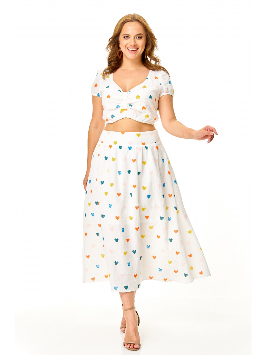 Невесомый легкий стильный комплект из воздушного муслина состоит из укороченной блузки и длинной юбки.