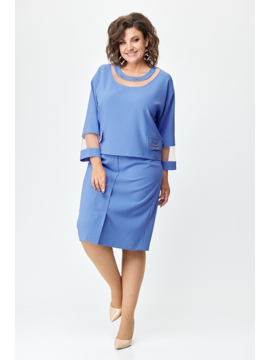 Блуза свободного силуэта летучая мышь со спущенным рукавом. Горловина переда состоит из сетки и декоративной планки. Рукав заканчивается манжетой. По передней части костюма клапаны и горловина декорированы отделочной металлической цепочкой. Спинка со средним швом на обтачке. На заднем полотнище по центру потайная молния. На переднем цельнокроеная складка имитирующая планку заканчивающейся шлицей.