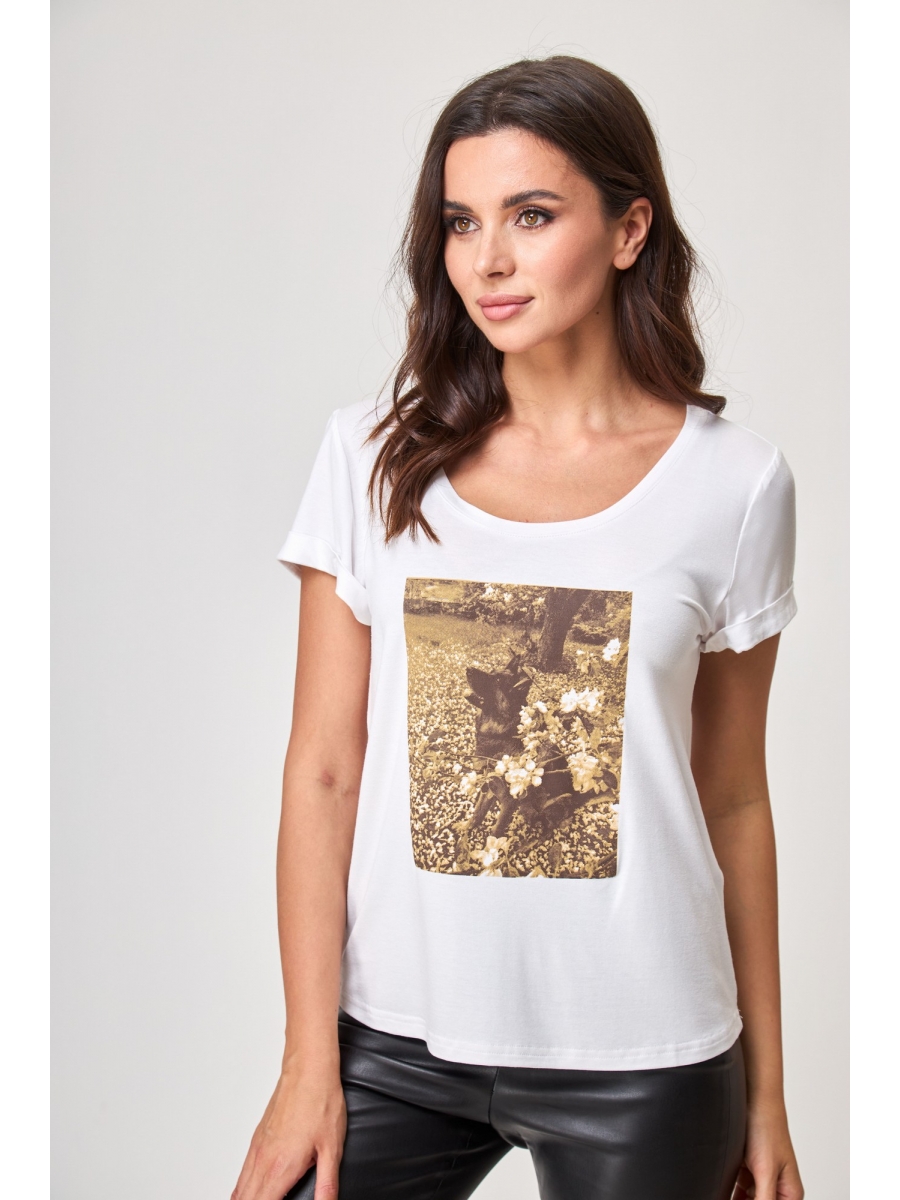 Футболка женская прямого кроя, длиной до середины бедра. Рукав втачной, короткий. По переду печатный принт. Горловина углублена, обработана стойкой.