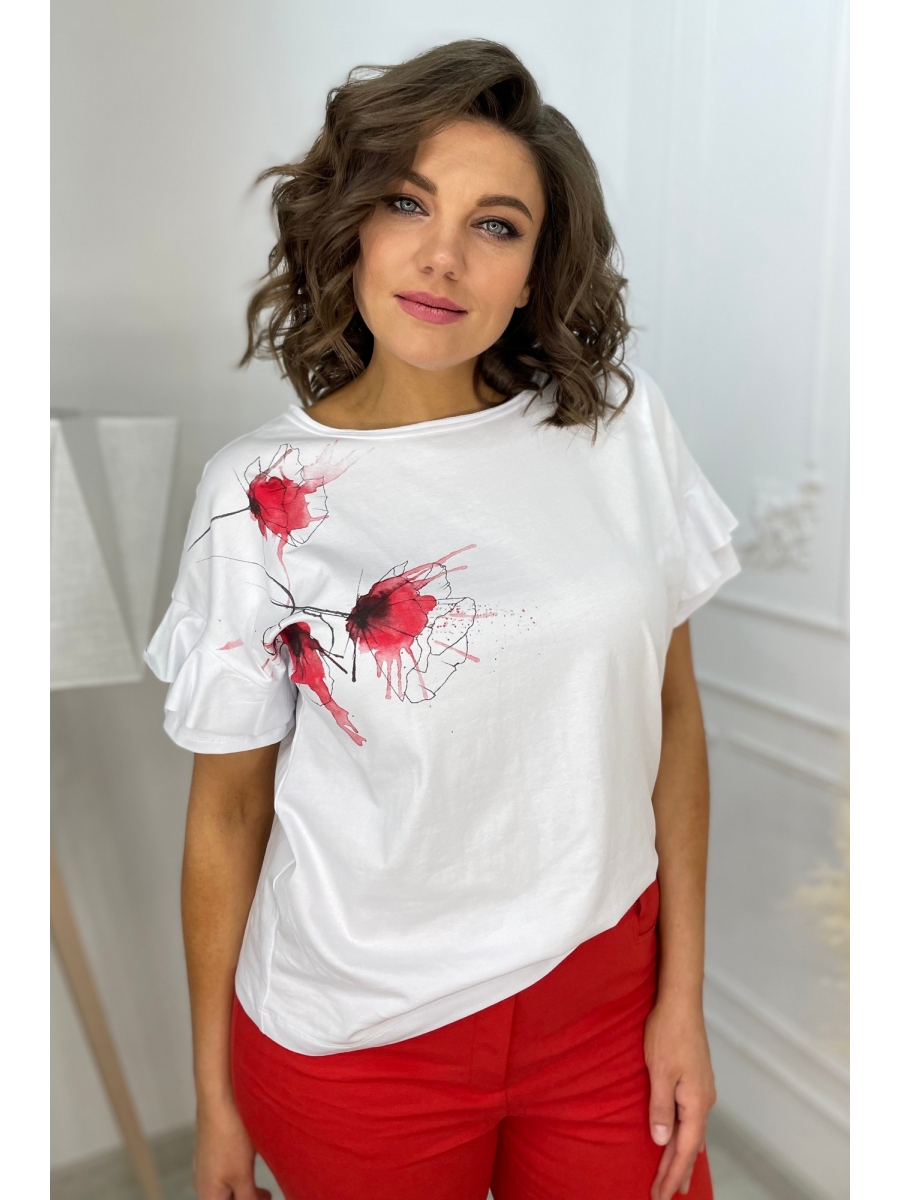 Футболка из трикотажной хлопковой ткани, со спущенным плечом. Перед футболки с принтом. Вырез горловины круглый, оформлен бейкой.В шов втачивания рукава,вставлен валан. Срез валана -не оработан. Спинка со средним швом.