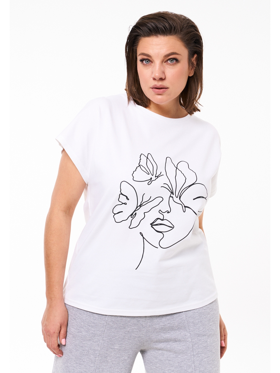Оформить заказ →Футболка женская с уникальным дизайнерским принтом, умеренного объема с цельнокроеным рукавом выше линии локтя. Перед с притом - силуэт девушки с бабочками. Спинка с углубленной горловиной и вертикальной планкой, собранной на резинку. Длина футболки до линии бедра.