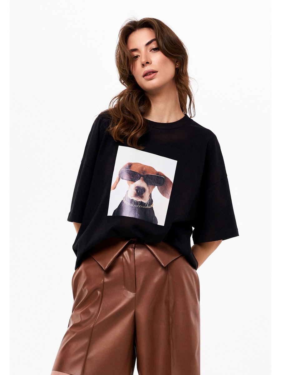 Оверсайз футболка из плотной кулирки с горловиной из довяза. По переду яркий принт.
