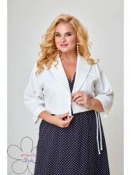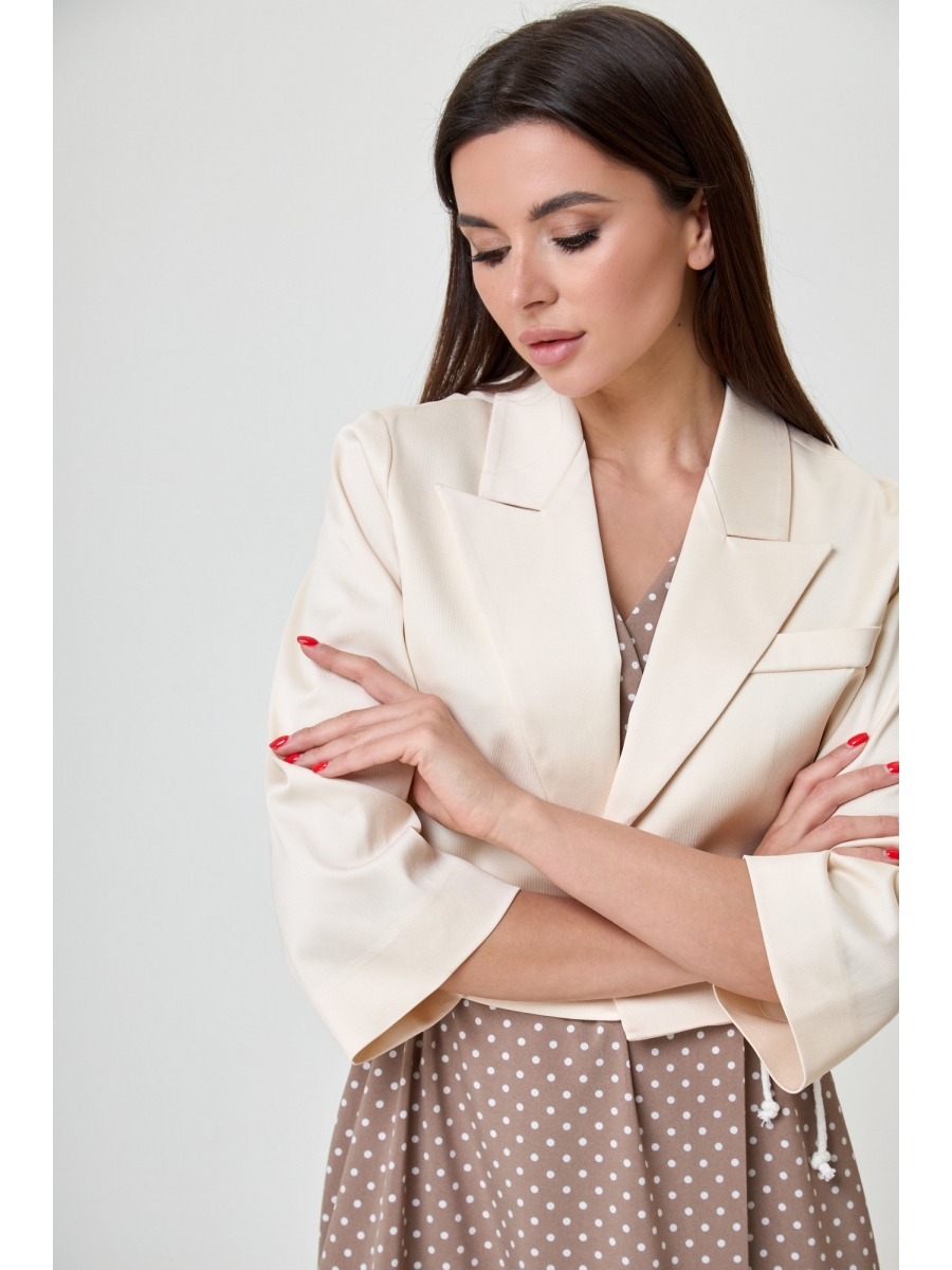 Жакет-болеро укороченный, на подкладке, длиной до линии талии. Рукав 3/4, втачной. Горловина обработана воротником с лацканом. По переду слева декоративная листочка.