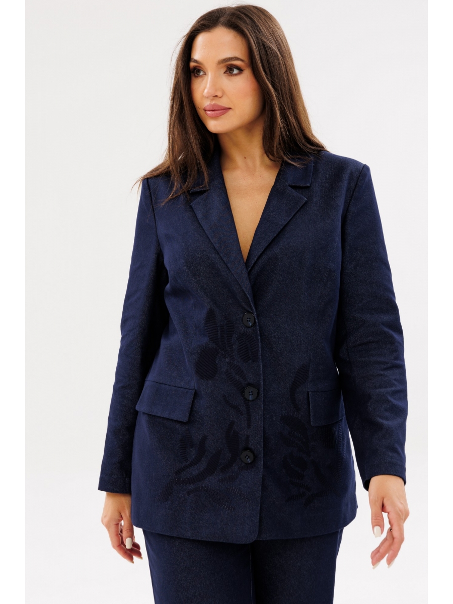 Жакет однобортный. Воротник пиджачного типа, застежка центральная на петли и пуговицы. Полочка с рельефами и прорезными карманами с клапаном. На полочке выполнена дизайнерская вышивка. Рукав одношовный втачной, длинный. Спинка со средним швом.