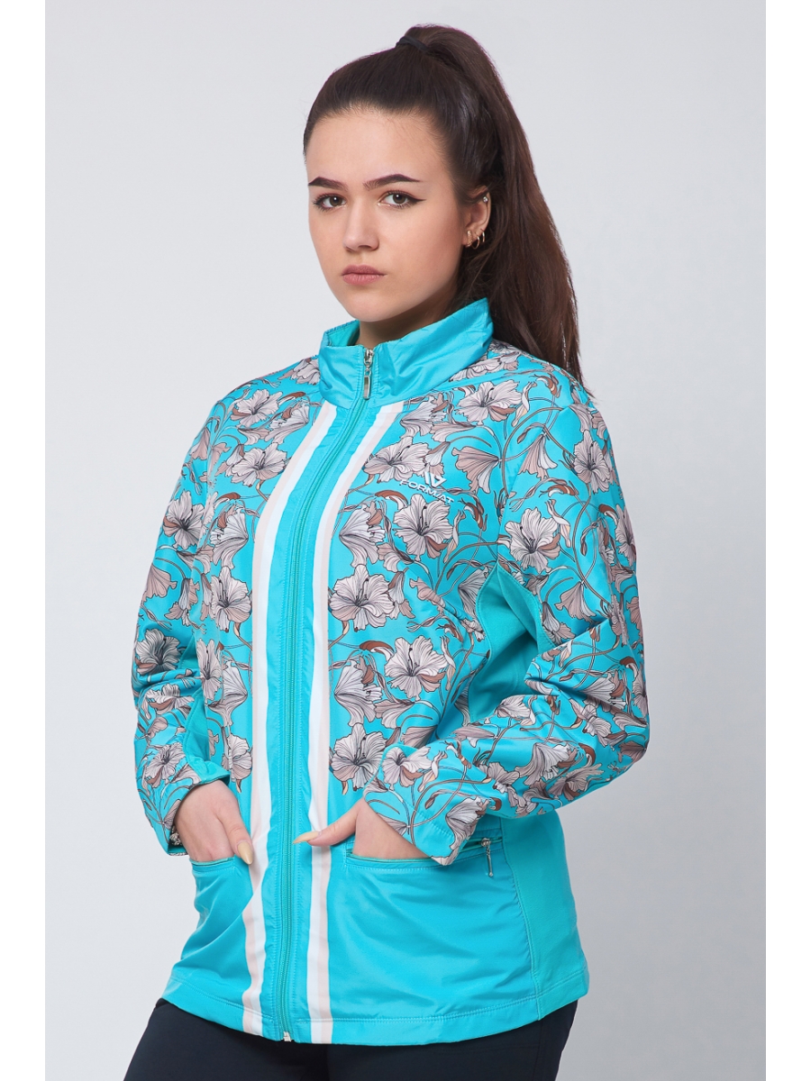 Жакет прямого силуэта с застежкой на молнии и воротником – стойкой. На передние полочки жакета, рукава и спинку настрочена плащевка с нанесенным на нее печатным рисунком. Так же на жакете имеются два симметрично расположенных кармана.