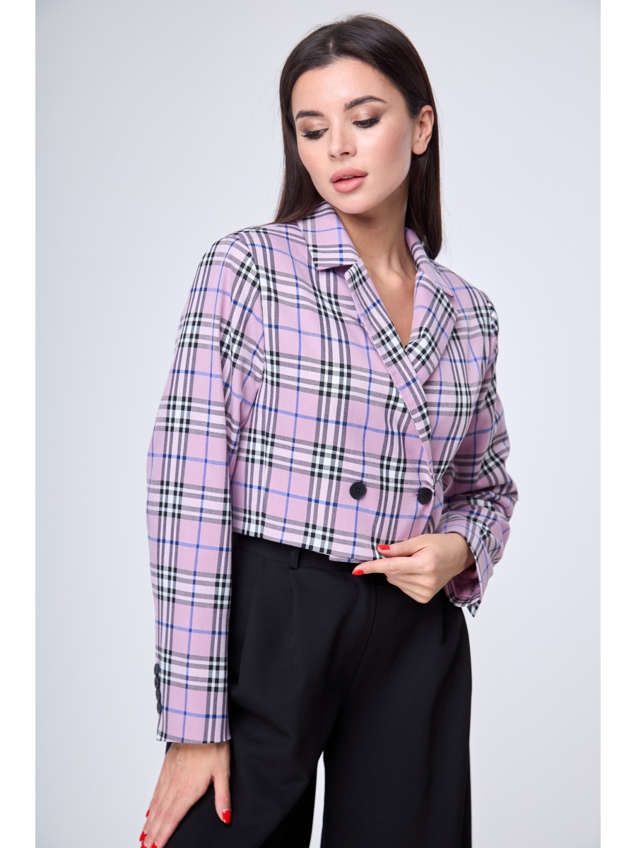Кроп-жакет-это укорочённый классический двубортный жакет из костюмной ткани. Один из главных трендов. Прямой силуэт, втачной двухшовный рукав со шлицей. Отложной воротник с лацканами. В среднем шве спинки шлица.