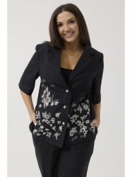 Воротник пиджачного типа, застежка центральная на три петли и пуговицы. Снизу полочки декоративная дизайнерская вышивка. Спинка со средним швом, который заканчивается шлицей. Рукав одношовный втачной, длиной по локоть.