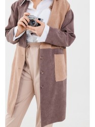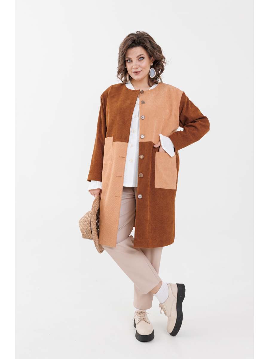 Его длина ниже колена. На подкладке. Спущенная линия плеча, рукав длинный. Округлая горловина. Накладные карманы по переду на уровне талии. По переду застежка на петли пуговицы. Жакет резной по вертикали и по линии талии.
