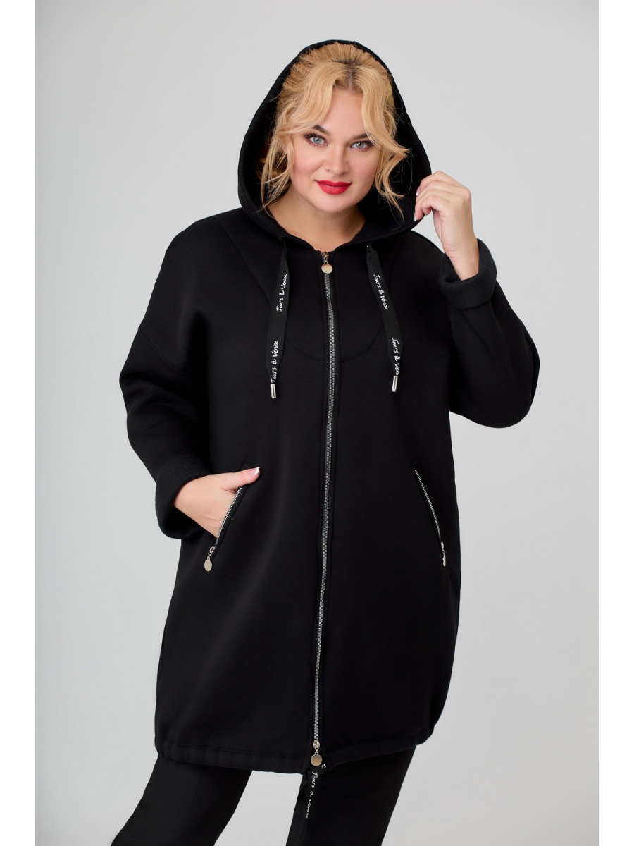 Жакет женский прямого силуэта. Линия плеча спущена. На передних деталях обработаны прорезные карманы на молнии. Застежка жакета на молнию, рукав с отложной манжетой. По горловине капюшон на кулисе. По спинке – аппликация. Низ спинки жакета фигурной формы, на кулисе.