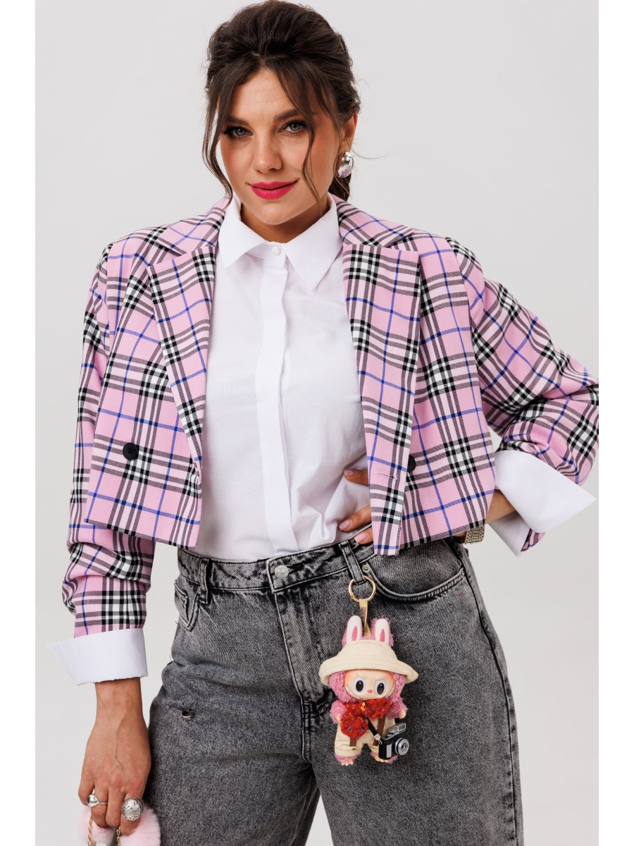 Этот укороченный двубортный жакет, словно созданный для тех, кто ценит баланс между классикой и современностью, идеально подчеркивает силуэт, добавляя образу лёгкую дерзость и безупречный стиль. Выполненный из благородной костюмной ткани в изысканную клетку, он сочетает в себе строгость кроя и игривость актуальных оттенков.