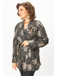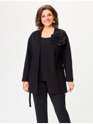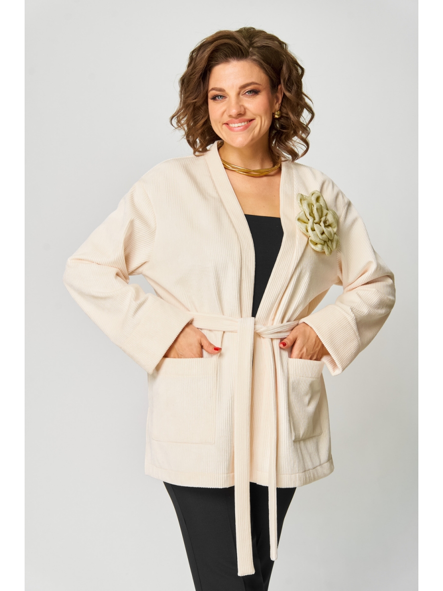 Жакет женский свободного прямого силуэта, длиной ниже линии бедер, без подкладки со съемным поясом и накладными карманами. По переду и горловине спинки притачная планка, без застежки. Линия плеча слегка спущена. Рукав втачной длинный с отложной манжетой. В боковых швах разрезы.