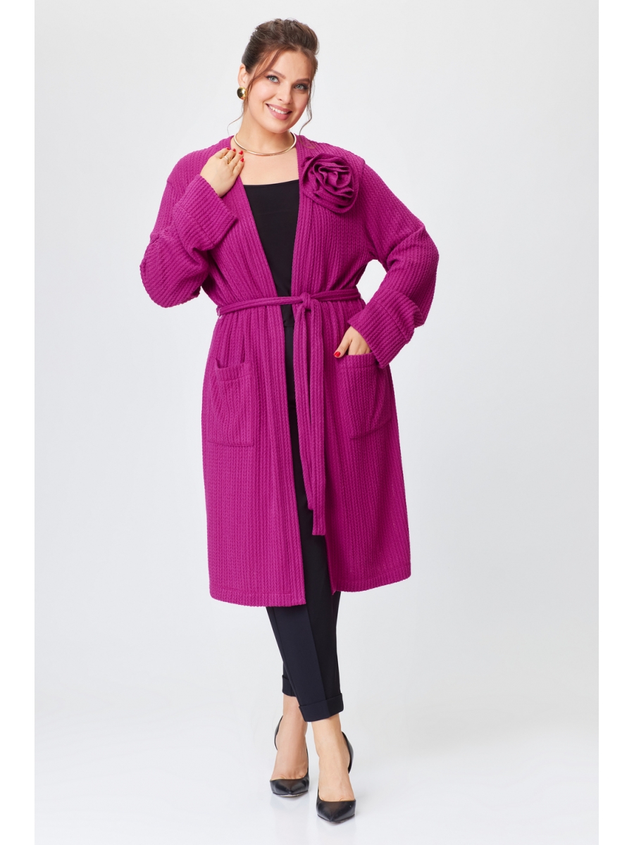 Жакет женский «One Size» прямого силуэта, длиной ниже колена, из эластичной трикотажной ткани. Жакет без подкладки со съемным поясом и накладными карманами. По переду и горловине спинки притачная планка, без застежки. Линия плеча слегка спущена. Рукав втачной длинный с отложной манжетой. В боковых швах разрезы. Украшен жакет съемным цветком из отделочной ткани.