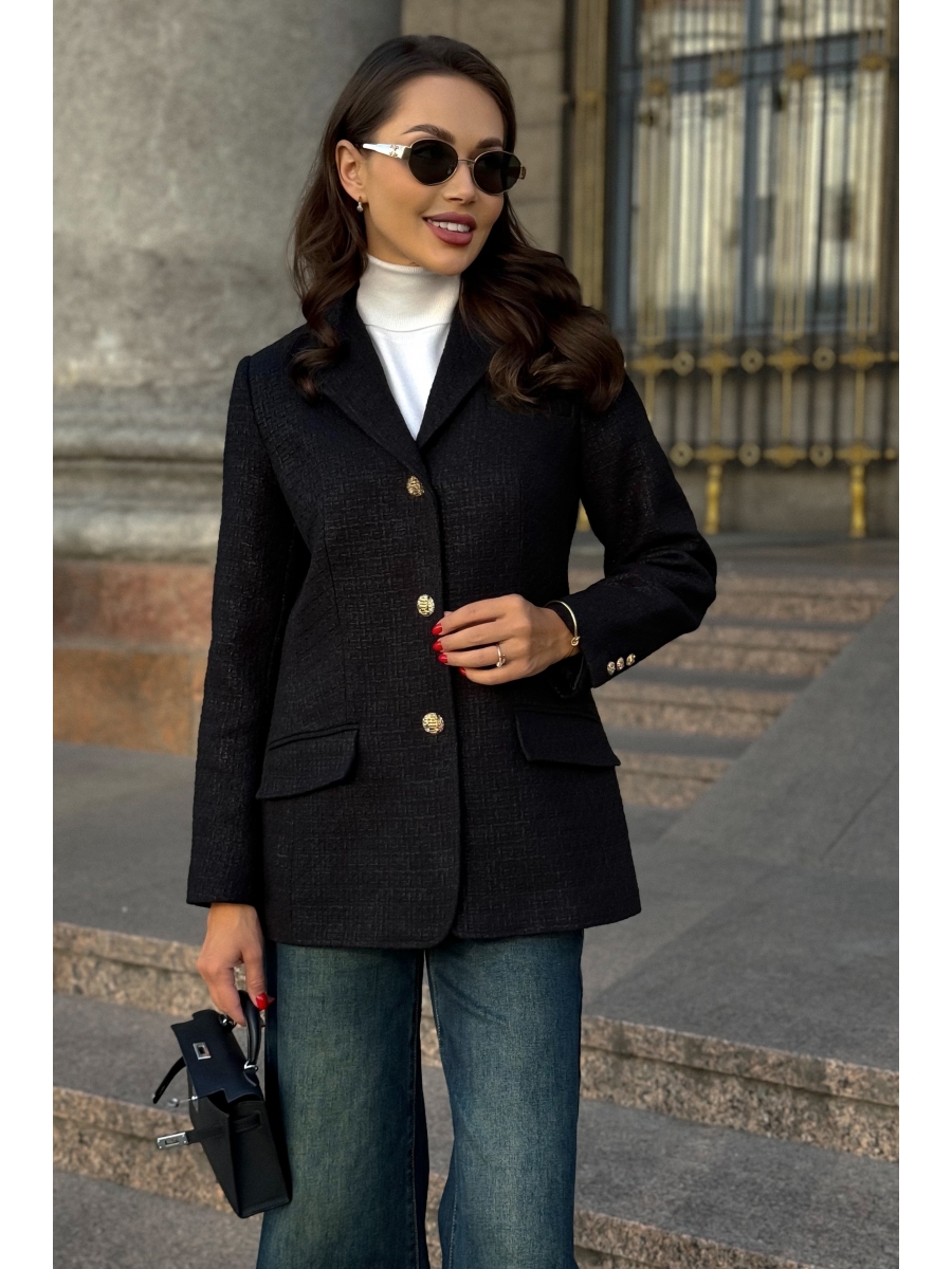 Оформить заказ →Чёрный твидовый жакет — стильный и универсальный элемент гардероба, который станет незаменимой вещью в период межсезонья. Этот твидовый жакет — стильная альтернатива плащу и пальто осенью. Он обеспечивает комфорт, тепло и позволяет выглядеть элегантно. Этот жакет сочетает в себе стиль и комфорт, идеально подходит для создания разнообразных образов — от классических до современных. Жакет женский полуприлегающего силуэта, выполнен из костюмной ткани рогожка, на подкладке, может быть как нарядным, так и для повседневной носки. Жакет с центральной бортовой застежкой на 3 петли и 3 пуговицы (фурнитура может незначительно отличаться от фото), по низу с закругленными бортами. Перед в нижней части с прорезными карманами с клапаном и двумя обтачками, с талиевыми вытачками, идущими от карманов вверх, с отрезными бочками. В левой верхней части переда расположена имитация прорезного кармана с листочкой. Спинка со средним швом, со шлицей, с рельефными швами, выходящими из проймы и идущими до низа. Рукава втачные двухшовные длинные, в низу локтевого шва обработана шлица, застегивающаяся на 3 петли и 3 декоративные пуговицы (фурнитура может незначительно отличаться от фото). Горловина обработана воротником пиджачного типа. Воротник ассиметричный, правый конец воротника фигурной формы с петлей. Жакет с плечевыми накладками.