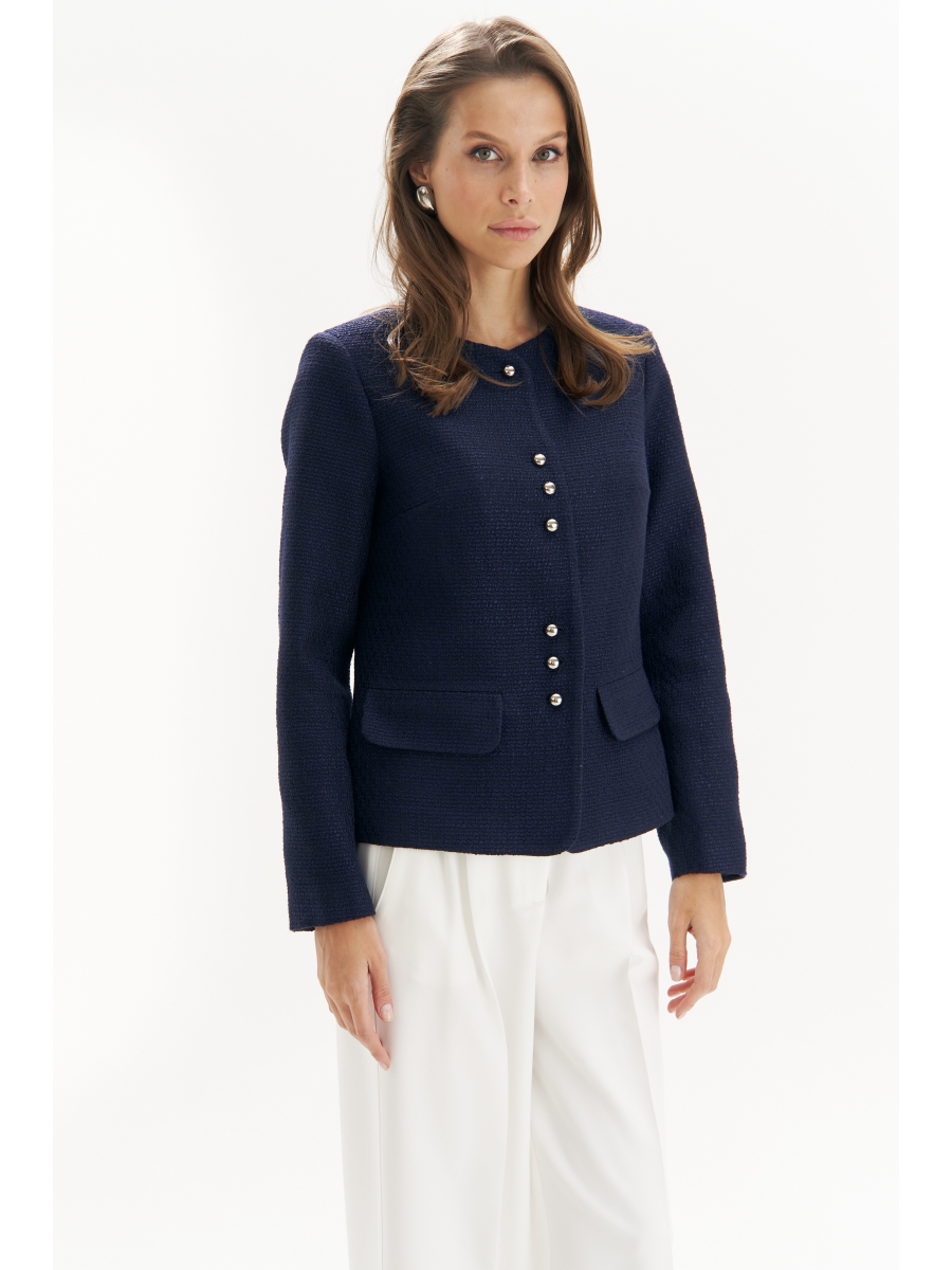 Темно-синий твидовый жакет – воплощение элегантности и утонченности. Классический крой без воротника придает образу строгий, но одновременно женственный вид. Ряд изысканных серебристых пуговиц подчеркивает роскошный стиль, а текстурная ткань создает ощущение благородного шика. Этот жакет легко впишется как в деловой гардероб, так и в стильные повседневные образы, сочетаясь с брюками-палаццо, юбками-карандаш и даже с джинсами. Идеальный выбор для тех, кто ценит стиль с нотками аристократичности.
