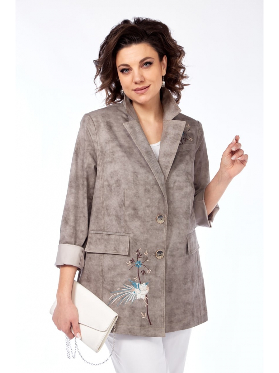 Жакет женский, прямого силуэта, выполнен из хлопковой ткани костюмного ассортимента. Воротник пиджачного типа, застежка центрально-бортовая на две петли и пуговицы. По переду обработана нагрудная листочка и прорезные карманы с клапаном и двумя обтачками, фигурные рельефы выходящие из проймы. Спинка со средним швом, в котором имеется высокая шлица. Рукава втачные двухшовные, с широкой подборкой низа. Изделие декорировано дизайнерской вышивкой.