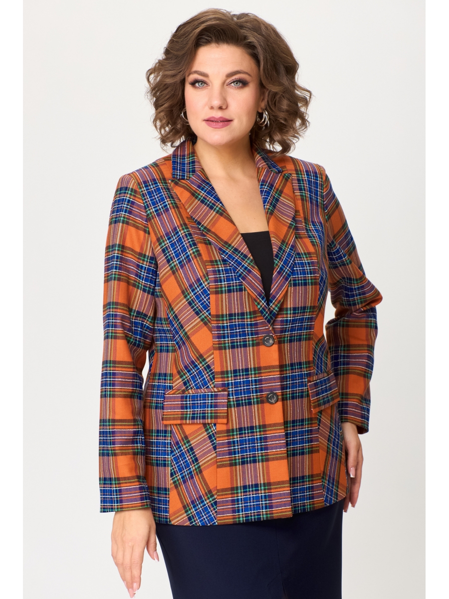 Жакет женский удлиненный, из текстильной ткани, на подкладке, полуприлегающего силуэта с центральной бортовой застежкой на пуговицы до линии перегиба лацкана. Спереди рельефные швы от плечевого шва, отрезной бочок и карман с клапаном. Спинка с рельефами от плечевого шва. Рукав втачной, двухшовный. Воротник пиджачного типа.