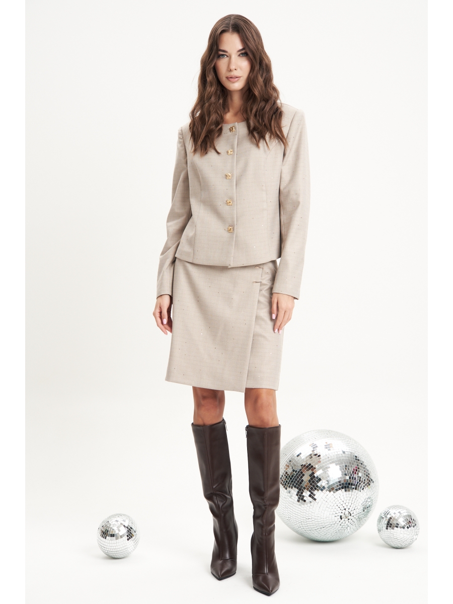 Жакет из необычного по текстуре материала с вкраплением пайетки, брюки из полотна без пайетки. Полуприлегающий силуэт пиджака с центральной застёжкой, круглым вырезом горловины и втачным покроем. Полочка с фигурным рельефом, спинка с фигурным рельефом, центральным швом и плечевыми вытачками. Рукав двухшовный.