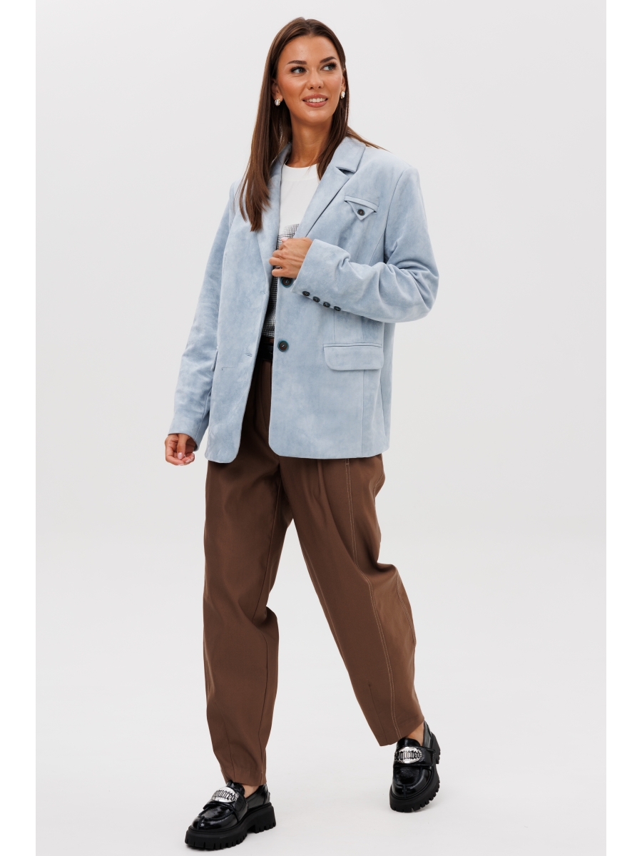 Оформить заказ →Жакет классического покроя, слегка упрямленный, с центральной застежкой, английским воротником и втачным двухшовным рукавом со шлицей. Полочка с нагрудной вытачкой, с прорезным карманом с рамкой и клапаном, отрезным бочком. На левой полочке оригинальный нагрудной карман с отделочной деталью. Спинка со средним швом и плечевой вытачкой.