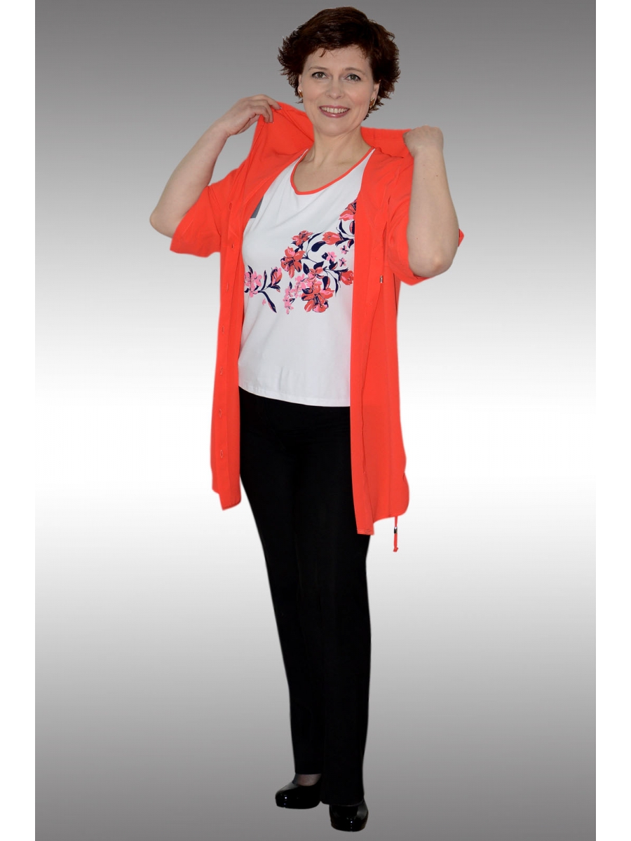 5304 - комплект женский, из вискозного топа и накидки из костюмно-плательных тканей. Накидка прямого силуэта с центральной застежкой на петли-пуговицы цельнокроеной планки. У накидки обработан капюшон, состоящий из двух половинок. Рукав накидки ¾, присобран патой, имеются нагрудные выточки, низ боков присобран шнуром. Топ – с печатью, горловина окантована.