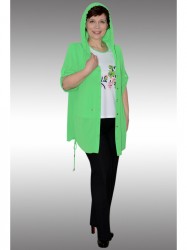 5304 - комплект женский, из вискозного топа и накидки из костюмно-плательных тканей. Накидка прямого силуэта с центральной застежкой на петли-пуговицы цельнокроеной планки. У накидки обработан капюшон, состоящий из двух половинок. Рукав накидки ¾, присобран патой, имеются нагрудные выточки, низ боков присобран шнуром. Топ – с печатью, горловина окантована.