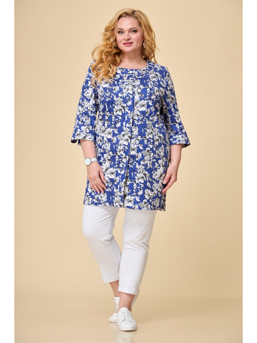Женский жакет-блуза, прямого силуэта, из хлопковой ткани. Горловина округлой формы, застежка центральная на притачную планку, застегивается на металлические кнопки. В отрезной части переда обработаны карманы. Спинка цельная. Низ фигурный. В боковых швах разрезы. Рукав втачной, двухшовный, с притачной манжетой, 3/4. Изделие без подкладки. По швам проложены отделочные строчки.