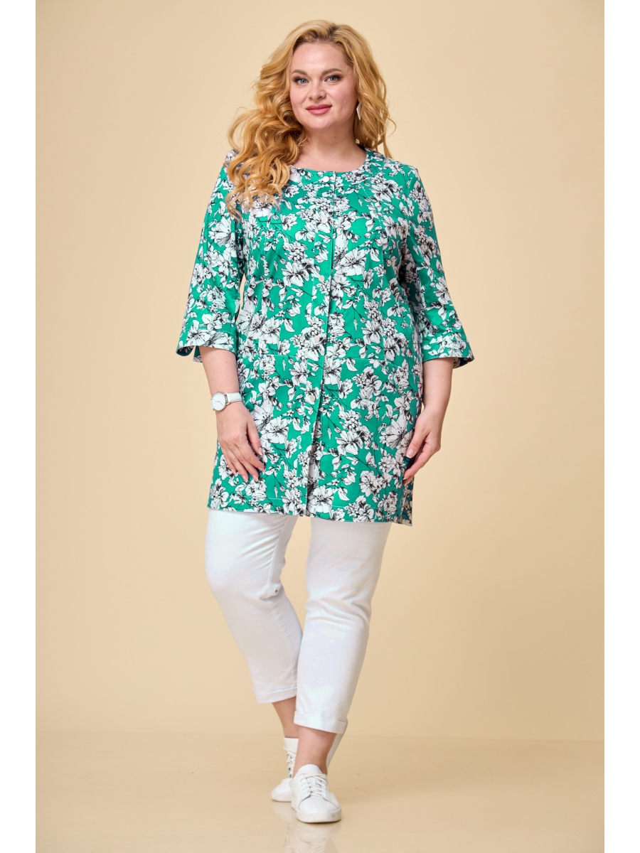 Женский жакет-блуза, прямого силуэта, из хлопковой ткани. Горловина округлой формы, застежка центральная на притачную планку, застегивается на металлические кнопки. В отрезной части переда обработаны карманы. Спинка цельная. Низ фигурный. В боковых швах разрезы. Рукав втачной, двухшовный, с притачной манжетой, 3/4. Изделие без подкладки. По швам проложены отделочные строчки.