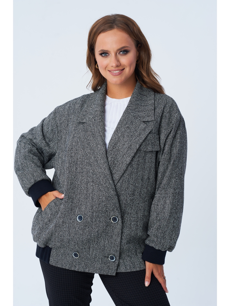 Жакет женский свободного покроя в виде куртки-бомбера из костюмно-плательной ткани с твидовым плетением "елочка". Жакет на подкладке. По переду двубортная застежка на петли и пуговицы, карманы с листочкой, декоративный клапан. Спинка цельная. Воротник пиджачного типа с лацканом. Рукав втачной на спущенной пройме. По низу изделия и рукава элементы из отделочной ткани.