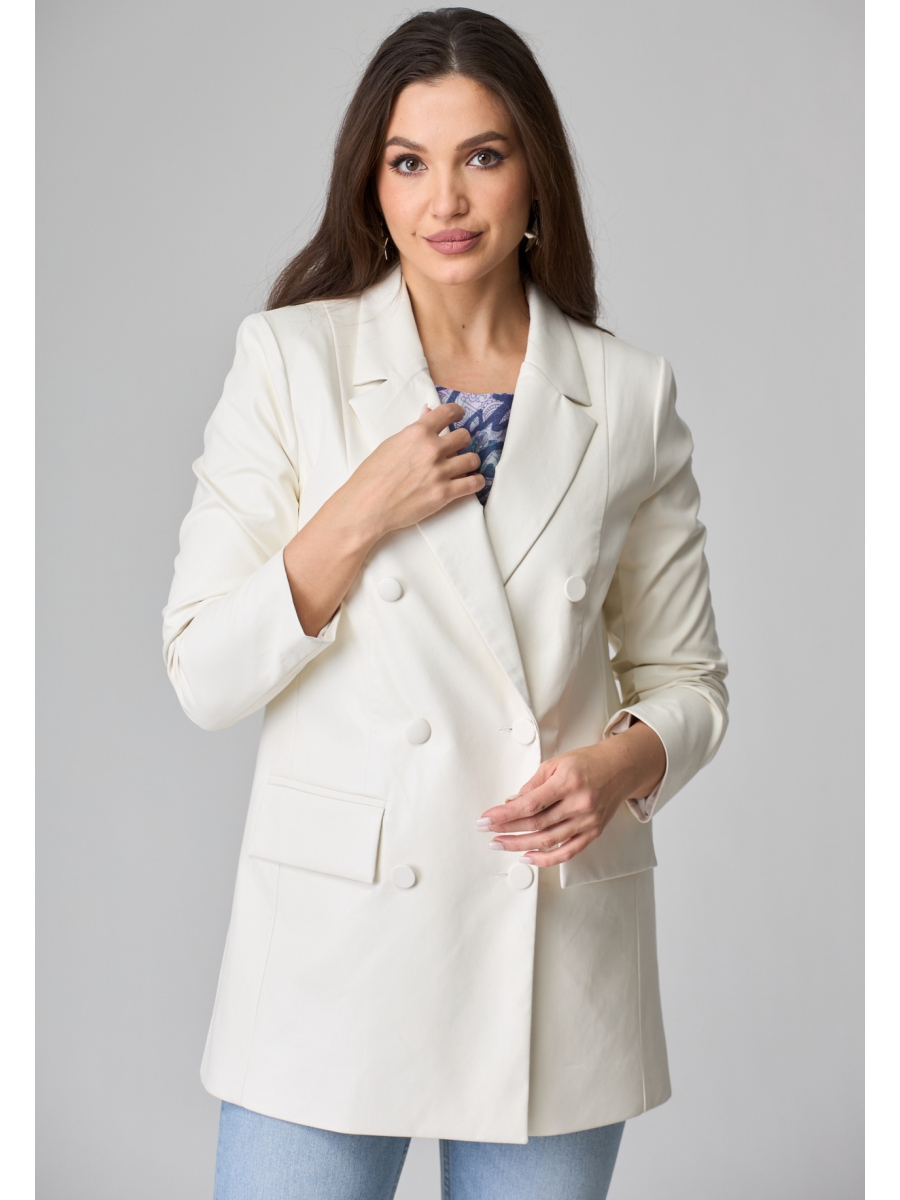 Жакет двубортный, свободного кроя, из текстильной ткани, на подкладке. По переду имеется отрезной бочок и вертикальные вытачки. С прорезными карманами с клапаном и двумя обтачками. Спинка со средним швом. Воротник пиджачного типа. Рукав двухшовный, втачной.