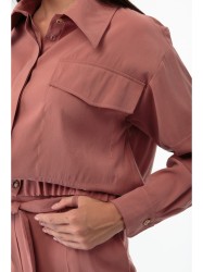 Блузон прямого силуэта, однобортный с потайной застежкой на пуговицы, отлажным воротником на стойке. Низ на притачном поясе с эластичной тесьмой внутри. Накладные карманы с клапанами. Рукава рубашечного покроя с декоративным подрезом с отстрочкой. Низ рукава на притачном манжете. Блузон дополнен съёмным завязывающимся поясом.