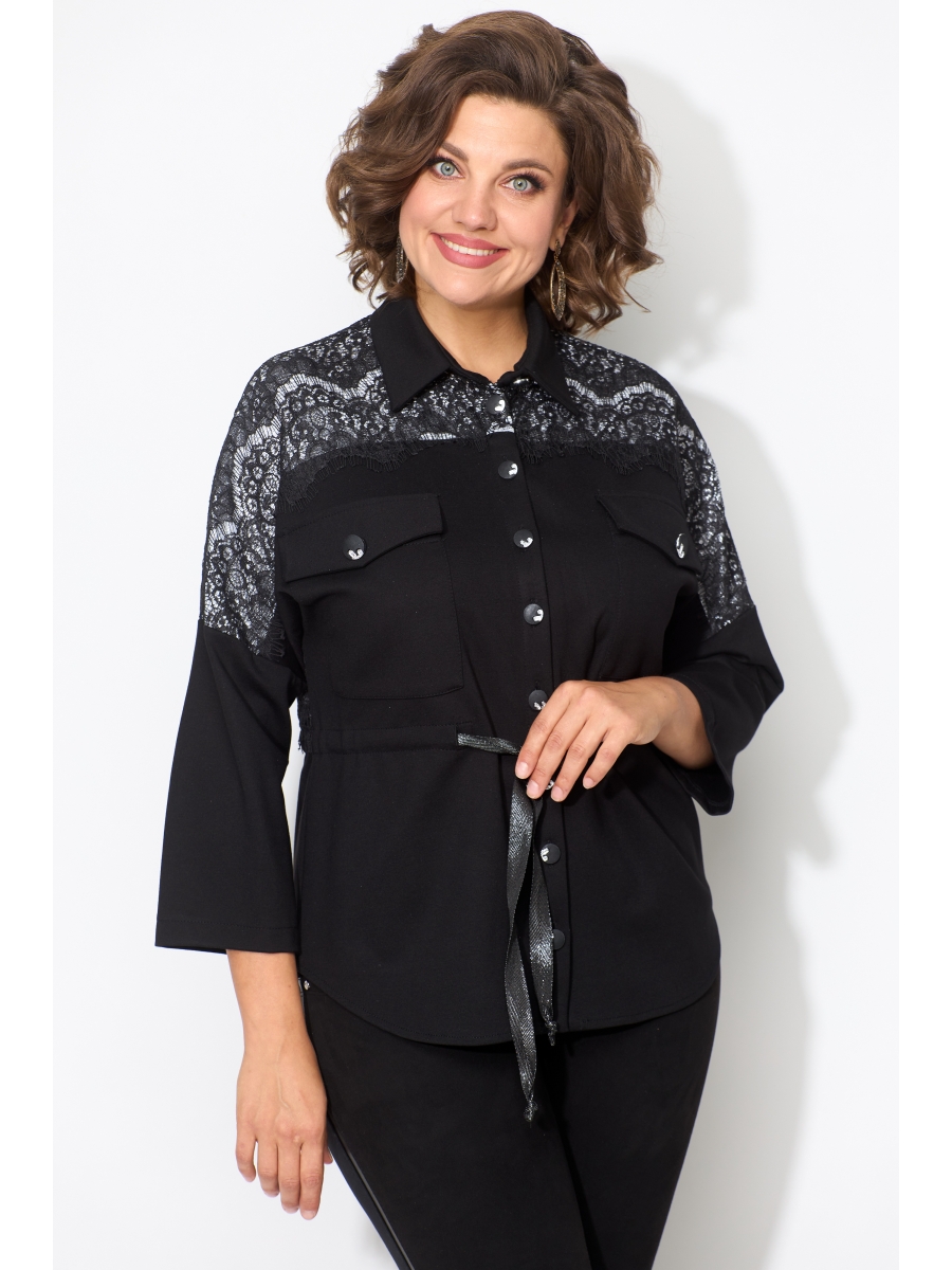 Жакет свободного кроя, силуэт-летучая мышь. Застежка-планка с петлями-пуговицами. Воротник рубашечного типа. По переду в области груди накладные карманы с клапаном. В области талии по спинке и переду вставлена кулиса, в которую втягивается декоративная тесьма, что позволяет регулировать объем по линии талии.