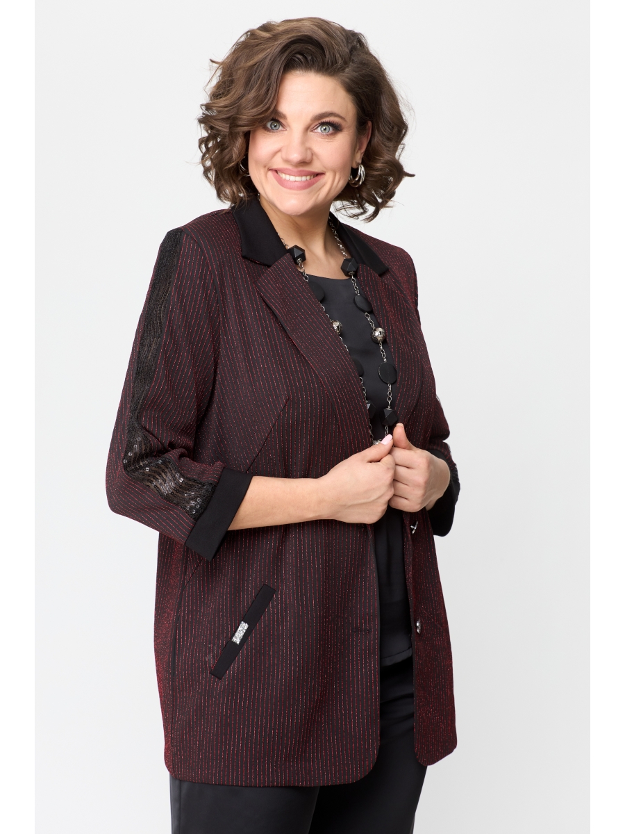 Оформить заказ →Жакет прямого силуэта. Спинка прямая. Полочка с нагрудной косой выточкой. По переду карманы (листочка). Рукав 7/8, по центру рукава вставка из сетки. Воротник лацканы, застежка на пуговицах. Жакет без подкладки.