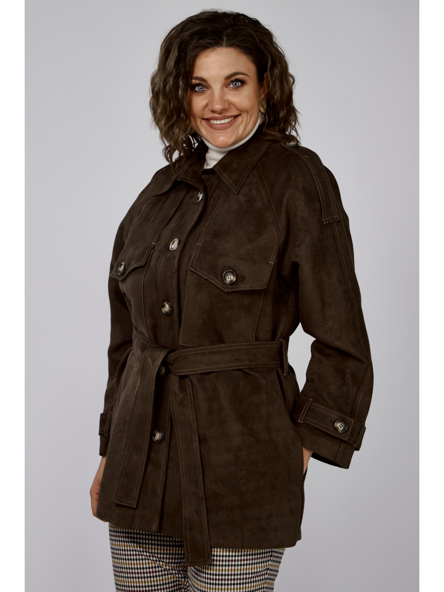 Оформить заказ →Жакет полуприлегающего силуэта, удлинённый, из смесовой ткани. Жакет с центральной застёжкой на планке на 5 петель и пуговиц. Покрой рукава - реглан. Детали переда с притачными планками. Перед с надстрочными фигурными клапанами, застегивающимися на одну петлю и пуговицу, и накладными карманами. Под клапаном обработана вытачка из проймы. Спинка со средним швом и отлетной кокеткой на подкладке. Рукав двухшовный с верхним и нижним швами. Рукав с декоративным погоном и пуговицей. Низ рукава декорирован хлястиком, застегивающимся на одну петлю и пуговицу, и шлевками. Воротник с отрезной стойкой. В боковом шве обработаны карманы и настрочены шлевки для пояса. Жакет на частичной подкладке.