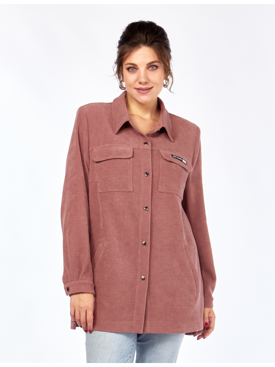 Рубашка прямого кроя с застёжкой-планкой на шесть петель и пуговиц. На переде обработаны нагрудные вытачки, кокетки, накладные карманы с клапанами, прорезные карманы с листочками. Спинка с кокеткой, складкой и отделочной шлёвкой по центру. Рукав втачной, длинный, по низу застёгивается манжетой с пуговицей. Воротник стояче-отложной с отрезной стойкой. В боковых швах разрезы, низ рубашки разноуровневый. Материал хорошо тянется (трикотажная основа) и держит тепло, поэтому жакет комфортно носить в прохладную погоду.